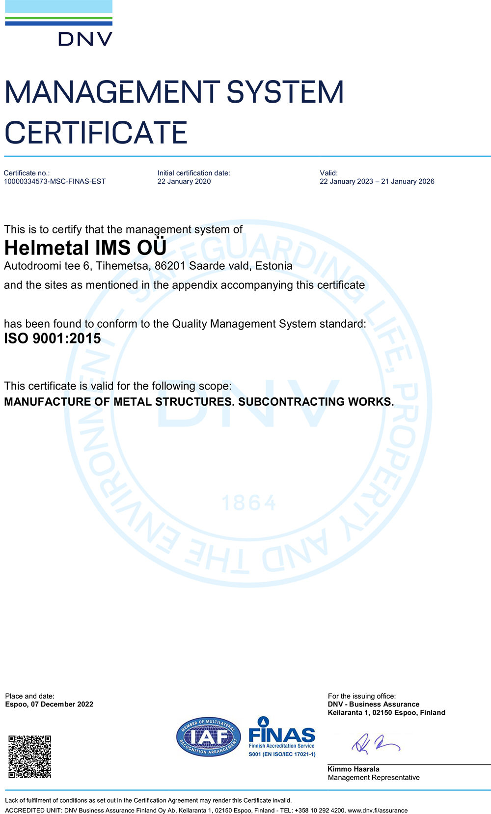 OÜ Helmetal IMS grundades 2004 med hjälp av estniskt privatkapital och inledde verksamheten med att tillverka kraftanläggningar. Idag har aktiviteterna expanderat högst avsevärt. Med målsättningen att utveckla vårt företag och tillverkning har vi under åren anskaffat en mängd olika arbetsbänkar och anställt kvalificerade specialister. I dag kan vi därför tillhandahålla våra kunder högkvalitativa tjänster inom sektorn metallbearbetning. Våra grundaktiviteter inkluderar tillverkning av metallkonstruktioner och maskindelar, plåtbearbetning och installation av specialanpassade konstruktioner i kundens anläggning.